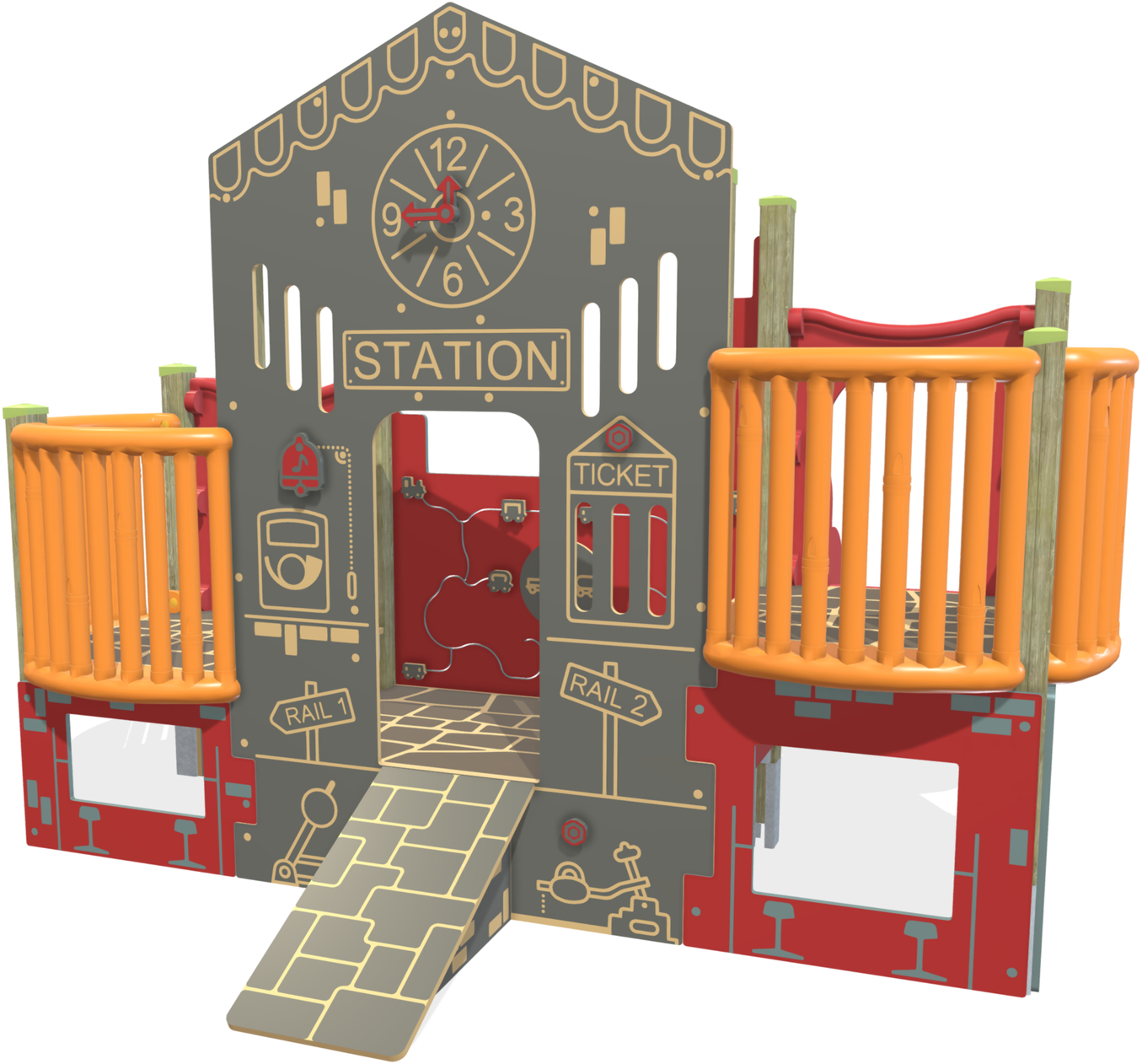 • rampe di accesso, scivolo h cm 84, tunnel, pannelli sagomati, parapetti, palline scorrevoli, coprimonanti in polietilene rotazionale, colorato nella massa